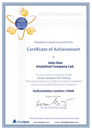 This online event fully substitutes training held in our office. The event is hosted by authorized DataApex technical personnel via negotiated online platforms, for example, Microsoft Teams. During the training, the participant is introduced to the knowledge regarding validation of Clarity Chromatography Software. The attendee is granted a certificate confirming attendance on the training and thus enabling him or her to perform validation of Clarity Chromatography Software on behalf of DataApex. The validity of the certificate is five years since its issued. An approximate length of the online training is about two hours.