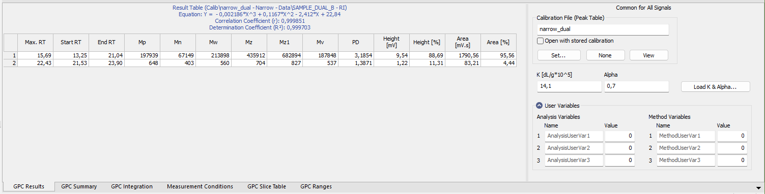 When a non-universal Narrow calibration is used (standards and unknowns of the same polymer), the K and Alpha parameters are not applied to the calibration curve or molecular weight results.