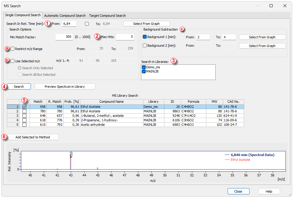 - When you are satisfied with the match (or multiple matches), use the check box ⑤ for the chosen compound and click Add Selected to Method ⑥ to add the compound to the MS Method.