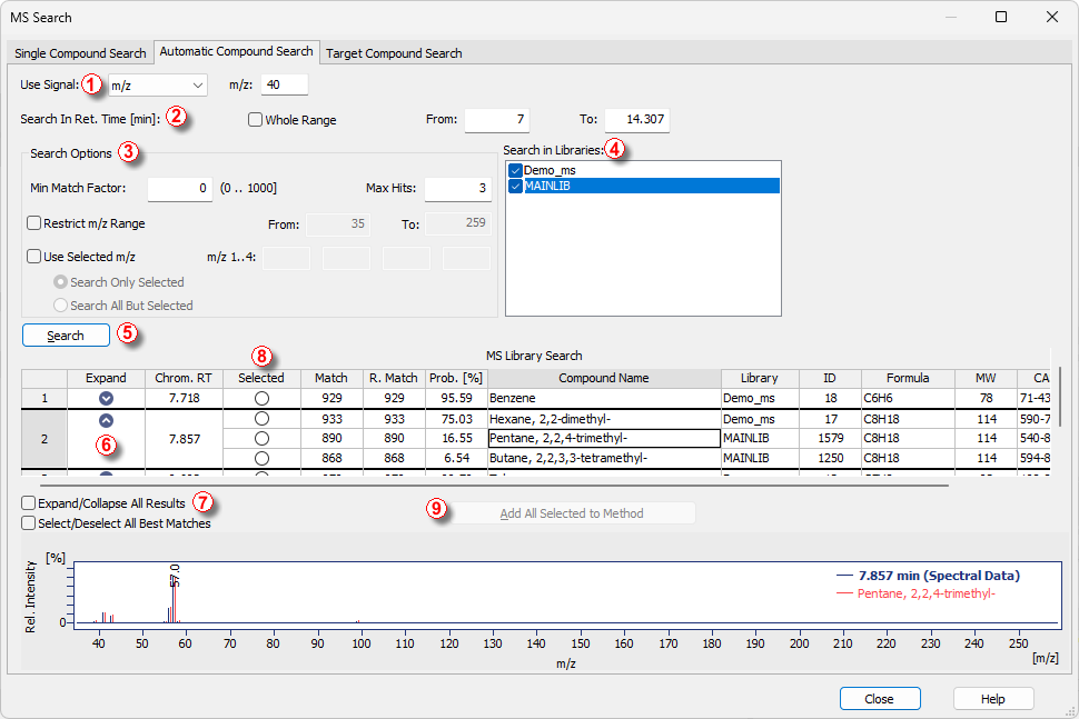 ⑥ in that row. To expand or collapse results for all peaks, use the Expand/Collapse All Results checkbox ⑦. - After reviewing the results, select the desired matches in the Selected column using the check box ⑧ (maximum one search result per peak can be selected).
