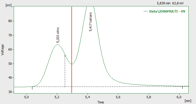 shifts the end of a peak. If this shift would move the peak end behind the beginning of the following peak, that beginning will be shifted to the selected point and both peaks will be separated by a vertical line. If the end of the peak before shifting has the same retention time as the start of the following peak and will be shifted closer to the peak apex, the following peak's beginning will remain at the original point and the peaks will be separated. The peak end may be shifted only within the interval delimited by the apexes of the following peak and the peak being modified.