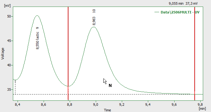 creates a new negative peak. It's beginning and end are defined by the interval borderlines, the apex is identified automatically. If the peak overlaps neighboring peaks, their respective start and end points will be shifted and the peaks will be separated by vertical lines. New peaks cannot be created inside the interval of tangent skimming, nor close to the apex of an existing peak.