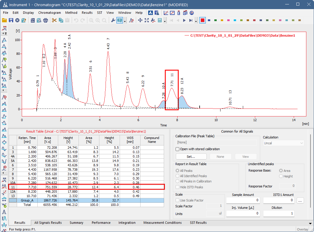 New row will be inserted in the Result Table that displays the summed values for all peaks in the group. Each peak in the group has its Group ID displayed next to its row number. If the Group ID option in the Graph Properties dialog is enabled, the group’s capital letter is shown in the chromatogram at the peak label. When you select the group row in the Results Table, the peaks in that group are highlighted in the chromatogram.