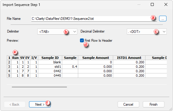 - If the text file to be imported contains column headers in the first row, use First Row Is Header ⓓ checkbox. This row is used for matching in the Import Sequence Step 2 dialog.