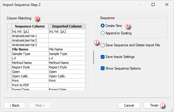 - Set the Column Matching ⓖ to match the imported columns with the ones present in Clarity Sequence table. Start vial number and File Name are required columns and are therefore shown in bold.