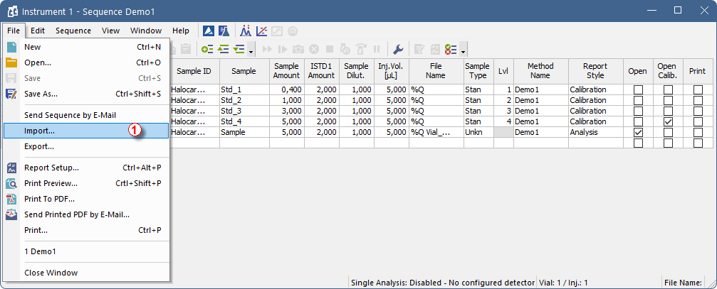 - Open the Sequence window and select File - Import… ①. This opens the Import Sequence Step 1 dialog, which opens in the directory defined in chapter "Setting up custom export and import directories".