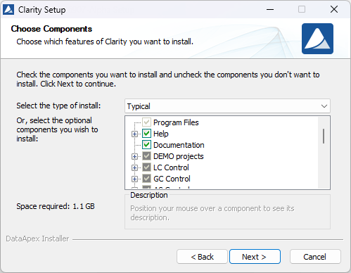In most cases "Typical" should be selected. "Custom"/"Full" installation is necessary e.g., for Agilent and other devices controlled via ICF, DANI devices and few others.