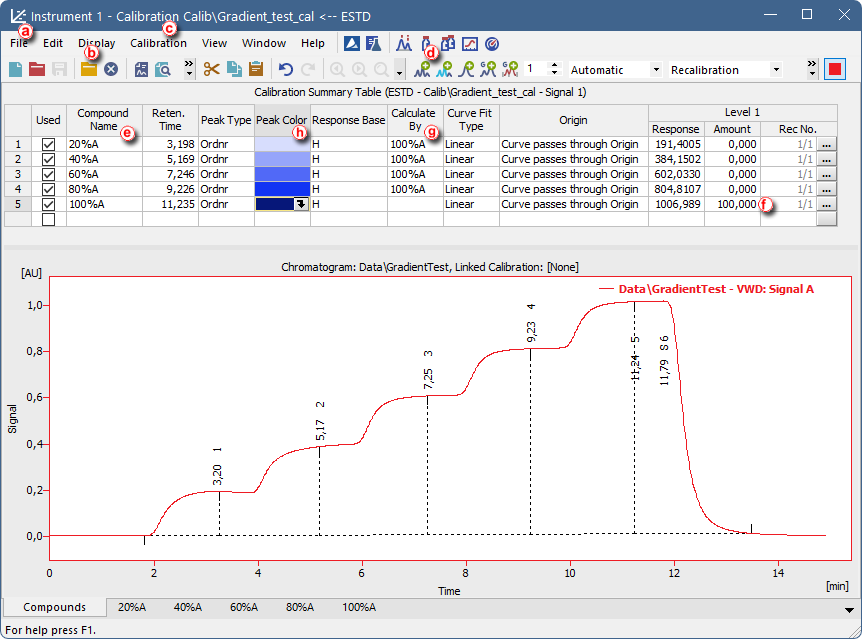 at the top of the window and save the calibration. - Return to the Chromatogram window and assign this newly created calibration to the chromatogram by clicking Set and selecting the calibration. The Amount value for the last gradient level should be exactly 100 %.