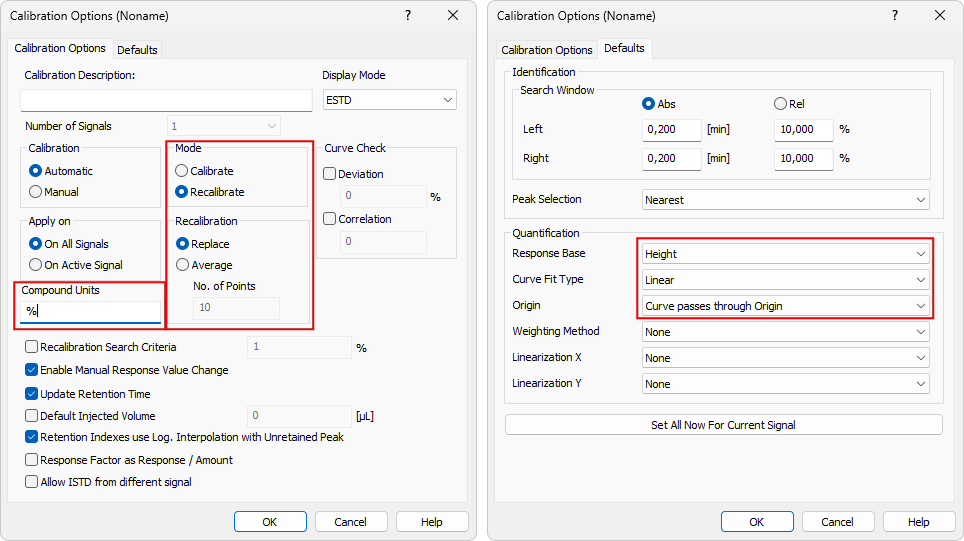 ⓑ and select the integrated chromatogram from the previous section. - Open calibration settings: using the Calibration - Options... menu. Compared to the default settings, adjust the following parameters (see the figure below):