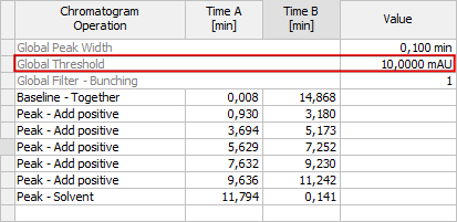 - Increase the Global Threshold value, if necessary, so that the entire gradient test record is integrated as a single peak (see the Integration Table example below).