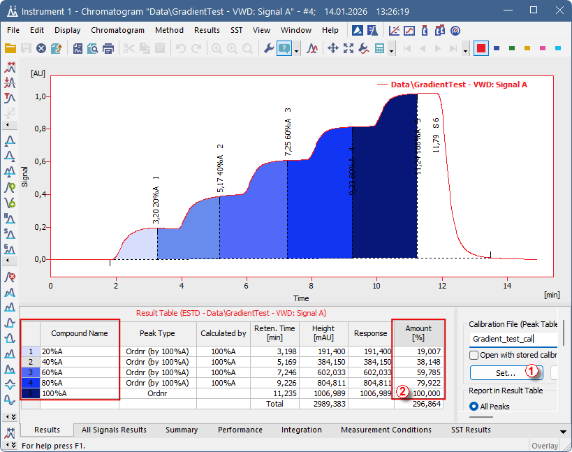 - Return to the Chromatogram window and assign this calibration to the measured gradient test chromatogram. On the Results tab, click Set... ① next to Calibration File - [None] and select the calibration created in the previous section and click Open.