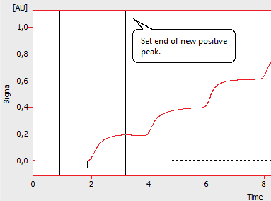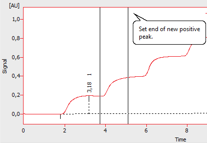 again. With the first click, mark the position on the previously selected constant section just before the signal increases to the next solvent ratio. With the second click, mark approximately the middle of the next step (plateau), corresponding to the next gradient ratio. - Repeat the previous step (7) for all remaining gradient levels. At the end, the number of Add Positive